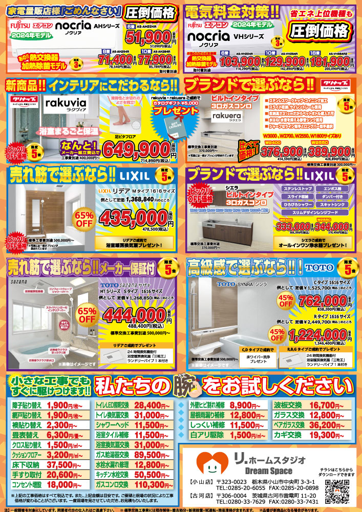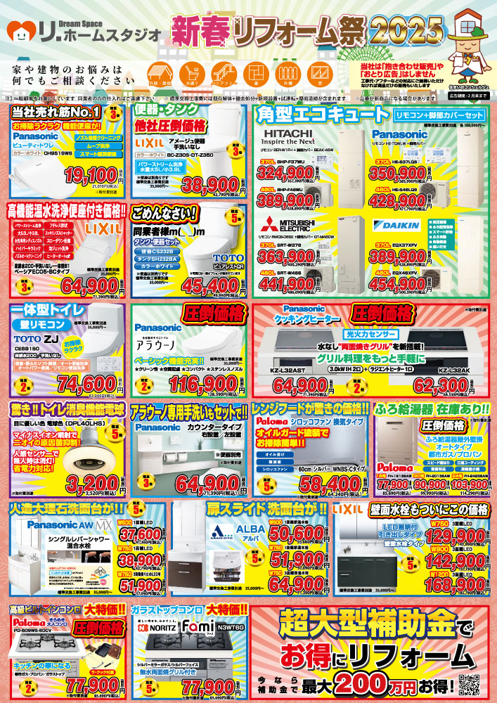 2025年1月10日 / 最終更新日時 : 2025年1月10日 rehome 「新春リフォーム祭」今月のお得な商品のご案内 新春リフォーム祭りのご案内です。 トイレ・浴室・キッチン商品など、家庭の快適さを向上させる多彩な商品を特別価格でご提供しています。これからの季節をより快適に過ごすため、ぜひこの機会をお見逃しなく!下記の画像をクリックするとPDFファイルが開きます。 関連